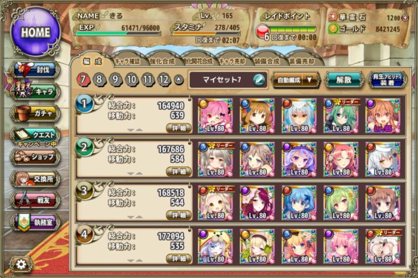 クリスマス~正月を開けて、編成が更に変わった Category:編成 Date:2019年01月03日 ちょっと前に編成を変えたよーと言いながら具体的な中身に触れずに・・・ぶっちゃけるとサボってる間に更に編成が変わったのでちょっとやり直し今回の編成はだいぶ手応えがある感じですねまぁ、また様子を見てちょっと入れ替える予定ですが大きな骨組みは見えたかと思います兎に角にも、出来上がった編成は次の通りです1個ずつ面白みと言うか、見どころと言うかざっくりとした特徴を紹介して行きますまず、第1の編成これはですね。管理人の夢と言うかロマンを含めた編成にもなって居たり正月ガチャのお導きもあったお陰か出来上がった編成ですずばり、クリスマスセンリョウを使いたいってのが管理人の目標でしたしかし、なかなか、センリョウって使い所が難しい完全に自己完結タイプなので、他の人のサポートも要らなきゃ他の人へのサポートも足りない本当に単騎で動くタイプなんですよねだから、他のメンバーが色濃くになるに連れてどこに入れようかと迷いますそこをズバット解決したのがこの編成ですね弱点付与を除いたり、1ターン目1.65倍を1つに絞る事でクリティカルダメージに集中させ、更に、サボテンの使い道まで用意した個人的に画期的な編成あ、細かい事は次回長々と書きます続いて第2の編成こちらはクリティカルと弱点付与を意識した編成これもまたその時に熱弁しますが、デルちゃんが強い意外とデルちゃんが便利第3の編成はクリスマスシロタエギクを主軸とした編成クリティカルと弱点付与と2とそこまで代わり映えはしません2と3の編成はもうちょっと考える点も無いこともないのですが今の手持ちで考えるとこうなりました第4の編成では、前から使ってる回避させつつスキルで回復とかをする編成ただ、最近出てきたヌシとかのステージに行くと辛い 対ヌシ用編成を考えた上で、4つ目の編成をこう変えると安定した単純に1ターン目に大ダメージを与える編成を4つにしただけですが・・・回避パは結局与えられるダメージに限りがある上一発一発のダメージがデカイ相手になると力負けしてしまうと言う弱点を克服する事が難しい単純に火力を持ってどんどん攻撃すると言う形になっちゃいますねいろいろとっかえたりしたので数値がだいぶ下がっていますがこれから徐々に強化して行きたいです PR