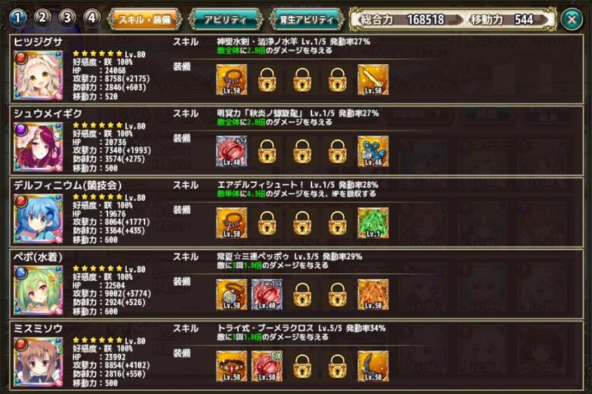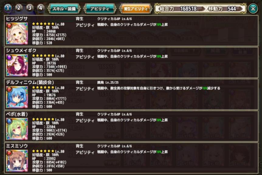 クリパ編成紹介 その2 Category:編成 Date:2019年01月16日 本日の編成は弱点付与、クリティカル重視、ついでに、回避と言う3コンボをかます編成です特徴としてはヒツジグサとデルフィちゃんヒツジグサと言えば、クリパを考える上で弱点付与がほしーなーと思えば、必ず名前が出る程に影響力が強いキャラですね弱点付与、クリティカル発動率アップ、タイプ数に応じて攻撃力アップとアビリティ面で見ると非常に頼りになる花騎士であり、拘りさえなければ、2体でも3体でも取ってそれぞれの編成枠に打ち込んでも良いぐらいの強さはあると思います弱点にクリティカルが発動し、更にスキルが発動すればめちゃくちゃ簡単にダメージアップが期待出来ますねそれぞれの役割としてはヒツジグサで弱点と、攻撃力バフ、クリティカルシュウメイギクでダメージアップと攻撃力バフ、スキルアップデルフィちゃんで、回避とクリティカルペポ(水着)で、火力担当とスキルアップミスミソウで、火力担当と攻撃力バフ、クリティカルペポ(水着)は1.65倍持ちでありながらも火力を期待出来る貴重な存在だったりしますこのメンツで行くと、デルフィちゃん必要?と思うのが最初の印象でした特別、極端に火力を出すわけでもなく、アビリティが強い訳でもないしかし、意外と、デルフィちゃんの回避能力が馬鹿にならないもちろん全体攻撃をされると厳しいが逆に相手が1体を狙ってくるタイプならばデルフィちゃんを狙わせるようにしておくだけで2ターン目が期待出来る1ターン目に比べて火力は期待出来なくなるがそれでもクリティカルさえ発動すればある程度のダメージは期待出来るそんな意味で回避を持ったデルフィちゃんが思いの外期待出来る戦力であったと言うのが実践を踏まえての感想でしたただ、クリティカルの発動率が70%なのでタチアオイとシュウメイギクを入れ替えるのもありかなー?と思ってるのが最近ですかね?他のメンツは意外と合致している気がしますデルフィちゃんは挑発これが大事 装備面の強化は追々やっていきましょう PR