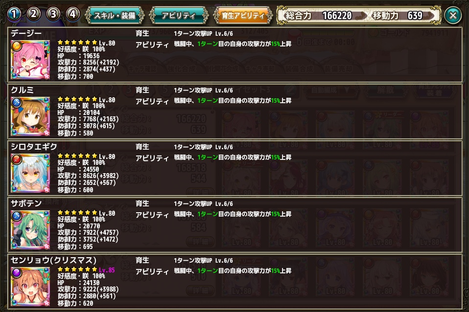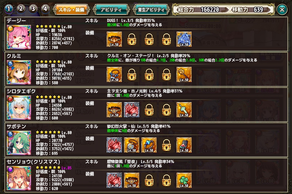 クリパ編成紹介その1 Category:編成 Date:2019年01月06日 福袋ガチャ的なものも終わって編成が一段落したので、現在の編成を紹介します今回はクリパを意識した編成ですこの編成のテーマとしては、クリスマスセンリョウを使ってみたい、ついでに、サボテンも装備の穴を沢山開けたのでどこかで使ってみたいなーと考えており、色々試行錯誤していたらこんな形で落ち着いたと言う代物です特徴としては、ずばりクリティカル編成と言う所ですねただし、この編成では、クリティカル発動率が70%と高いと言う程ではないのが難点他の編成の都合で、ウメが抜けているのですが、昇華なりで、クリティカル発動率30%アップを入手し他の編成と入れ替えた上で、ウメをこの編成に入れるのが最終的な目標になりますちなみに、ウメはシロタエギクと交代する予定です先の話の通りにクリティカルの発動率は70%でクリティカルダメージが205%アップ(実質255%)しますクリティカルさえ発動すれば与ダメ2.5倍になるという安定性を犠牲に上振れをした際の期待が高まってるようなちょっとギャンブル性を持つ編成ですかねこれはスキルの発動率にも同じように言える事で1.65倍を1つのみに絞る事で編成枠に自由性を持たせていますただし、その反面、スキルレベルを十分に上げないとスキルの発動率が安定しないと言う欠点も持っていますクリスマスセンリョウ、及び、サボテンは自身のアビリティや素の発動率の高さと言う点で、理屈として理にかなっているメンバーと言えるかも知れませんただ、他のメンバーのスキル発動率がまだまだ低いのでスキルのlvを上げたいですね今後はスキル発動率1.65倍持ちを1体で済ませる事を意識した編成が大事になりそうな予感がしています編成と言えば、弱点付与と言うアビリティも重要なのですがこの編成に限って言えば、その分をクリティカルダメで補うと割り切ってしまって、なくても良いやと考えた結果になります安定性は低いけど、一発決まれば与ダメは高いと特に、センリョウの再行動及び、サボテンの再行動がいい感じに弱点相手に決まると、それはもう凄いダメージを与えますね育成アビリティは1ターン目に絞りました最近の強敵相手になると2ターン目は誰かどうか倒されている事が多いのでもう1ターン目にしか期待しません運良く2ターン目に生き残って更に追加ダメージを与えればラッキーと言う具合ですね繰り返しになりますが、安定性はありませんその代わりに1回1回の戦いで同じ結果にはなりません思った以上に彼女達が健闘した、思った以上にダメだったといろんな結果が出るので、ある意味見ていて楽しい編成になっています PR