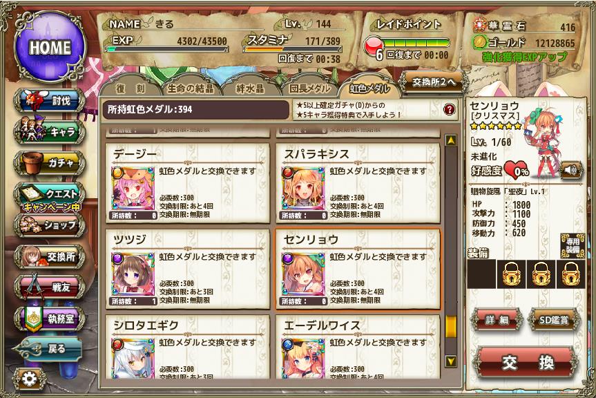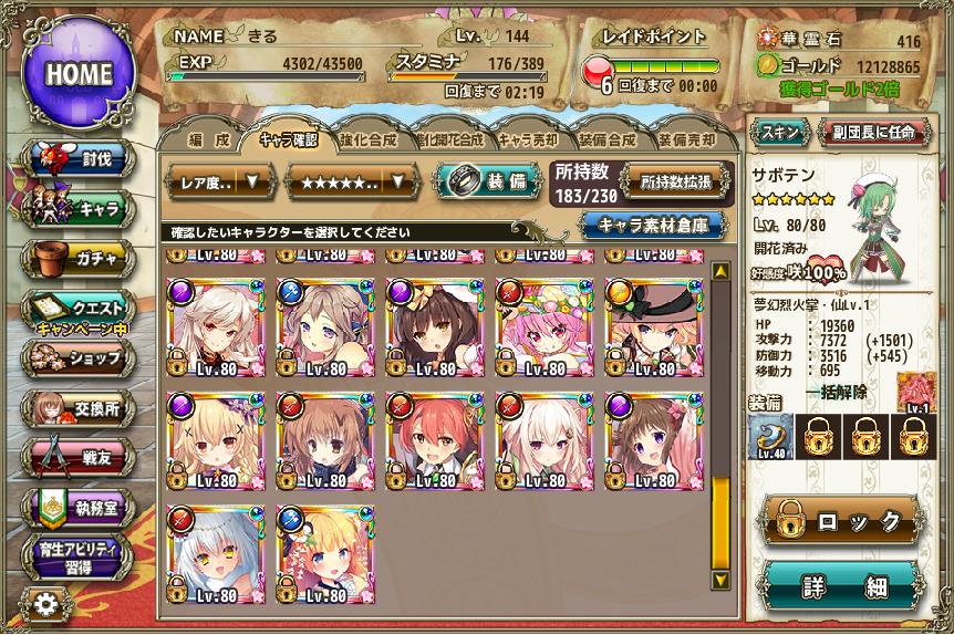 フラワーナイトガール(花騎士)の紹介 Category:雑記 Date:2018年04月29日 あんまり管理人の愚痴や不満だらけに埋まっても面白みの欠片もないので癒しを流入させる意味も踏まえてフラワーナイトガール(通称:お花、花騎士)を紹介してみますプラットフォームは艦これとかでよく知られているDMMで一般でもR18でも遊ぶことが出来ますまぁ、R18についてはあまり深く触れないものとして・・・うん、ほら、えっちなのはいけないと思いますとどこかのメイドさんも言っていましたし紹介とは言っても、管理人やってる事はやっているけれど他の方に事細かに説明できるほどはやり込んでいないのであくまでも管理人が触れた世界観での大雑把な感想になります花騎士に関しては既に多くの方がその手の紹介記事を書かれているので本気でプレイを考える方はいろんなサイトを巡ってみてください半端な知識となりますが、それでも花騎士と呼ばれるゲームに関してあれこれ伝われば良いかなーと思っていますざっくり言って、何が良いかと言うとキャラクターが可愛い事ですね管理人が千メモをプレイしている理由の大半を占めた理由でもありますやっぱ、可愛いは正義好きなキャラクターで遊ぶ、これがゲームの醍醐味管理人の編成を紹介するとこんな感じになっていますどこのゲームでも同じなんですがやっぱレアリティが一番高いキャラが強いとそれは仕方のない事このゲームでは虹と呼ばれるレアリティが強く管理人も頑張って虹を集めてみんな虹で揃える事が出来るようになりましたまぁ、編成の中身に関してはだいぶ趣味と大雑把が混じっているのでおかしな点があるだろうなってのはうっすらと自覚しています残念な事にどんなゲームにも欠点がありますよねこのゲームの場合は戦闘が単調であること(ほぼクリックするだけで勝手に進むオートゲームなので)そして、虹と呼ばれる最高レアリティが非常に入手し辛いと言う点ですこのガチャの確率を見れば明らかなのですが、虹と呼ばれる☆6のキャラってのは0.5%しかありません、8.5%っぽく見れますが本当に0.5%でしか出ません他のガチャでも一緒です千メモで新実装されたリタで大目玉なリタを狙う確率ってのが何%とか知りませんが、恐らくそれといい勝負でしょうか!(適当ですけどね)0.5%で出現する☆6キャラの中から特定のキャラを出すとかそれはもう狂気の沙汰ですね出るわけがないそして、じゃあ、なんで管理人が虹キャラをいっぱい持っているのかそれにはそれ相応の理由があったりもします一つ目の理由としては、何かしらのタイミングでちょっと古いけれど、好きな☆6キャラを選べるチケットが付属したガチャが5000ptで回せるキャンペーンがあるという事ですね5000円とか高いと思うかも知れませんが、まぁ、千メモで無茶してガチャ回す事を思えば、大した額ではない他にも新規で始めた時などにはご新規キャンペーンみたいなものでこれもまた5000円でちょっと古いかも知れないけれど好きな☆6が選べるものがありました基本的に課金する事が前提となってしまうので無課金でやろうとするとこの☆6の虹レアリティと会える事が非常に稀になってしまうのですがまぁ、そこは個人のプレイスタイルと要相談ですねめっちゃ難しいクエストでなければ☆5でも十分に攻略は出来るみたいです二つ目の理由としては通常ガチャや団長メダルを集めて交換するチケットで入手可能な(団長メダルとかを説明するとまた長くなるので次の機会に)虹色メダルと言うものを300枚集めると実装されている☆6のキャラクターからお好きなキャラを1体選べるのだこれが本当に凄いと思う新規に実装されたばかりのキャラでもこれ交換できちゃうんですよだから、頑張って貯めて持ってればめっちゃ好みのキャラが来た時にすぐ交換できちゃうただし、お察しのとおり、簡単には入手出来ませんこれもまた話が長くなると言うか現時点で予定より書く内容が多くなっているので残念ながら省略しますがちっとやそっとで300枚は集められませんじゃあ、どうすんだよ!となりますがこれもまた、特定のタイミングで開かれるガチャで虹色メダルがおまけとして付いて来るのでそれを引いて集める形が一番現実的ですねこうやって紹介するとどうしてもお金がかかる印象が強いのですが根気よく待って、狙ったタイミングである程度のお金を入れるとそれに見合っただけの報酬は得られるとそんなゲームだと管理人は感じています純粋にガチャで狙って☆6を出そうとすると余裕を持って地獄に逝けるだけのお金はかかりそうですけどね管理人の☆6のキャラは全部でこのぐらいです運良くガチャから出てくれたりどれがかわいいかなーと思って選んだり可愛さは2番目として性能でコイツ欲しいと選んだりぽつぽつとキャラが増えています花騎士にも打タイプは存在します斬、突、打、魔と射タイプこそないものの奇遇にも千メモと同じようなタイプ分けをしておりこの辺も馴染みやすいものだったり
