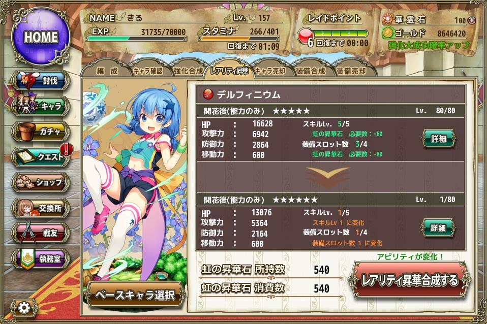 スマホ版リリースに合わせたあれこれどれ Category:フラワーナイトガール Date:2018年09月02日 スマホ版リリースをそっと見守っている管理人なのですがまぁ、結局の所、今の様子を見ているとベータ版に近いような仕様なのでもっといろいろ実装されてから本格的にアピールした方が良い気がするのは気のせいだろうか・・・とか言っても、普通にはプレイ出来るぐらいには仕上がっているのでもうちょいの辛抱だと思います今はまだDMMのブラウザ版から入った方がわかりやすいと思いますスマホの画面とにらめっこして編成とかは考えられるので別に管理人は使ってないことはありませんそれはそれで置いといて・・・まず、スマホ版のアプリ配信に伴い☆6が入手出来るガチャチケが来ましたね未入手キャラが1体確定なので誰が来るかな~ロリキャラ来ないかな~と引いてみた所お姉さんキャラが来た(いや、見た目がね)管理人の好みは基本的にロリか貧乳かジト目かそれ以外かで分かれる・・・とかそんな話はどうでも良いのですがウメが出ましたね別に見た目は嫌いと言うわけではなくて好みではないと言う事なのでお間違えの無いように例えば、ステーキが大好物な人が居て刺し身は普通には食べるけど、好みではないと言うそのぐらいの認識刺身丼があれば刺身丼を食べますがそこに一緒にステーキ丼があればステーキ丼を選ぶとそのぐらいの認識うん。何だこれウメの特徴を考える上で恐らく外せない部分としてはクリティカルの発動率30%アップだと思います加えて、クリティカルダメージも55%アップとクリパには欲しい人材なのではないでしょうか後は、何気に光ゲージが50%アップするのってのもクジラ艇を意識すると重要だったりもするあまり意識してなかったけれど、入手してみると思った以上に強力なキャラでした(まぁ、わりと最近調整されたってのもありますが)クリティカルの発動率30%ってのは何が凄いかと言うと30%がもう1体居たら30、30、20%で組めば、それでもう上限の80%アップになるんですなるんですよつまり、空いた2枠に1ターン目スキル1.65倍を入れるとスキルが100%発動して、更に80%でそれがクリティカルになるのも夢ではないとそれを考えたら、やってみたくなって作っちゃったなけなしの昇華石を全部ぶっこんで作っちゃった作っちゃったやっふーい!!8割型見た目で選んでこの娘を選択ちびキャラの動きが大変可愛らしいので即採用クリティカル発動率が30%アップするのでこれで上限の80%だぁ!と思っていたらさ・・・この後に編成をいろいろ考えたいたらちょっと、考えがわかったその件はまた次回にまとめます後は、これ全員配布キャラのコルチカムいやさぁ、どうせこの手の全員配布キャラってさぁ例えば、最高レアが☆6だとしたら、性能的には☆5.5ぐらいの性能になっちまうってのが良くある話ですよね?ところがどっこいアビリティを見ると普通に編成に入れられるだけの物をちゃんと持ってるのが素晴らしい実際に管理人の第二のクリパに入りました新規で始められた方でクリパを作ろうと思ったらこれ配られて良かったと思う方も大勢居るでしょう後は、あれですね花騎士でよくある5000円で選べるチケット的な奴ですね一応余裕を持って編成出来るだけのキャラを持っているのですが好きあらばより中身を充実させようと積極的に狙っていきます今回選んだのはシュウメイギクですねロリキャラとかじゃない?管理人にも見た目以外で選ばないとならない時があるのですよ性能面で!ちなみに、ガチで見た目も良い性能も欲しいコムギと迷いましたでも、今回はシュウメイギク次のチャンスがあればコムギか、他に欲しいキャラを狙いますこれだけ欲しいキャラが増えたので次回は編成をまた改造してみますだいたい、記事を書く前に部隊が変わるのが最近の管理人記事の更新がめっちゃ滞っています頑張る、頑張りたい、頑張ってみたい、頑張ろうと心の中には気持ちが残っています PR