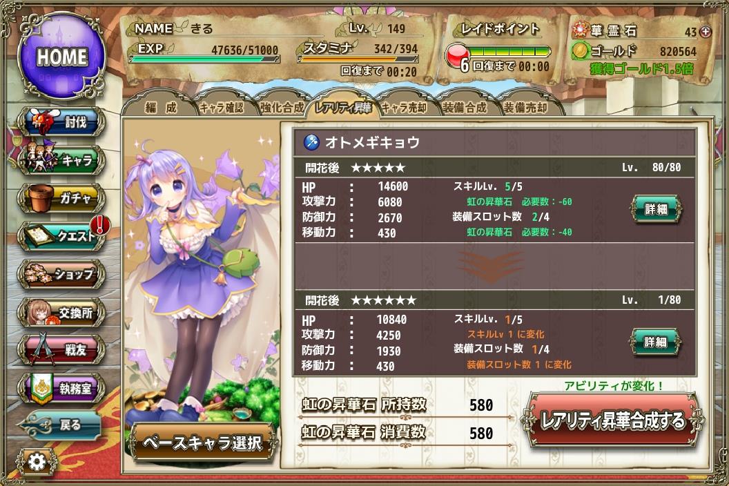 デバフパの改良と今後の目標? Category:フラワーナイトガール Date:2018年06月12日 ある日思った、デバフパを作ろうとその原因は主にトリカブトちゃんが可愛い事とデバフを持っているキャラが何体か居たためそこからちょいちょいっとキャラを探したりしていたら最後に辿り着いたのはオトメギキョウでした昇華しますか?しませんか?やっぱ、やってから後悔するのが人生です人生3度目の昇華Dメダルがカナリ犠牲になりましたとさ・・・しかし、昇華によってだいぶ欲しい戦力が補充出来た感じですねやっぱデバフパには吸収持ちが欲しいこれがあると敵の攻撃力を下げて、こちらは攻撃をしつつ回復すると言う、なかなか嫌らしい戦法が取れますおまけにこのキャラは回避を持ってると来たもんだ便利ですよ~更に本日のアップデートによってスキル倍率と発動率が微妙に上昇なかなかに期待出来る数値となりましたちなみに個人的には真ん中のスキンがお気に入りですしかしですね・・・本日のメンテで実装されたイベントキャラがなかなかに良い性能を持っていると言うのもまた事実なんですよ困っちまうよミズヒキと言う新キャラなんですが敵の防御を下げるわ味方の防御を上げるわ回避するわスキルで回復するわやっべ、こっちでも良かったじゃんと思いつつも・・・まぁ、いずれかまたこっちも入手してみようかしらね?イベントキャラなので入手自体は確定しているのですがいかんせん昇華石が全然タリーン30個で回せるガチャで22個を入手して集めるとなるとイベキャラは615個あれば昇華出来るので28回ぐらい10連回せと、石840個か無理ですね!もともと、管理人的に今回の昇華に使った昇華石だけでもギリギリだったんで、今回はオトメギキョウで我慢いずれかまた機会があればミズヒキも視野に入れつつ他のキャラとを考えて昇華させましょうそのうち、5000円とか何かのセットで昇華石でも来ないかなぁ~なんかオトメギキョウとミズヒキを見比べているとオトメギキョウ損したなぁ~と思ってしまいますオトメギキョウを入れた新しい部隊はこんな感じ吸収SP持ちってのが頼もしい所下2人を囮にして、他の面々がぼちぼち攻撃する形です現在だと、デバフとしては最高値の70%で固めつつなんとなくヘレニウムを入れて防御力をアップ(あんまり意味ないと思うのですが)全体的にスキル発動率がちょっと微妙なのですがいかんせんそう簡単に上げる方法もないのでぼちぼち上げていきますそう考えると、ミズヒキよりはオトメギキョウの方がスキルの発動率が高いので、まだこっちでも良いと言う理由はあると言えばありますかね今考えているのは、マロニエをミズヒキといずれ交代させるかどうかと言った所です全然昇華には程遠いお話なので、完全に妄想なのですがそうすると、デバフが65%に落ちるのですが吸収スキル持ちが3体となりより、生存率が上がりそうなのと気持ち防御アップも入るので、されどうなるかな?と言う思いはありますねまぁ、昇華に関しては他にも使いたいキャラがでてきそうなのでなんとかして欲しいのですが、入手がなかなか上手く行かないのが悲しい所ですね次回はデバフパと回避パの使い勝手を考えてみたいと思います PR