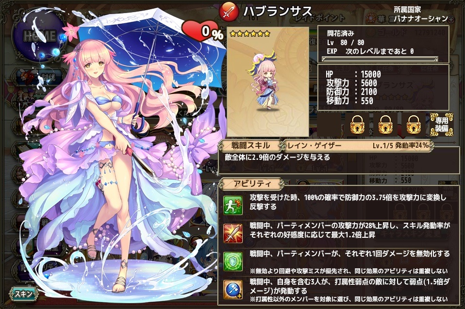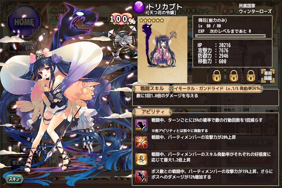 マイペースに育成中(トリカブト天つ花の令嬢に期待) Category:フラワーナイトガール Date:2018年11月04日 当面の目標はエノテラちゃんの昇華だと固く誓った管理人まだまだ昇華まで時間はかかりそうですが昇華させれば、回避しならスキルで回復と回避パに欲しい所を持ってくれているので期待していますしかし、全然昇華石が足りないのでどうしようもないトリカブトちゃんに関しては普通に運用出来る程度には育成完了これで装備枠1個ぐらいは空けるってのが鉄板だと思うのですが・・・昇華石が欲しいと言うのもまた本音装備枠2個は欲しいかなぁーアビリティに関しては新アビリティになる25%の確立で敵の行動を1回減らすってのに期待デバフパでも活躍が出来そうなのですが回避パでの運用を期待して居ます相手の攻撃を回避するのが主体な回避パにおいて敵の攻撃が発動しなくなればそれだけで生存率が上がりますねそして、意外とスキルは5.4倍ダメと高倍率スキル発動率も攻撃面でのバフもそれぞれ無難に保有しているので戦力としては十分に期待出来そうです・おまけ未所有キャラが入手出来ると言うガチャで出ました・・・けど、恐らくは使わないでしょう防御よりであり、1回ダメージを無効にするアビリティは強力ですが・・・1回ダメージを無効にした所でどんなもんだってのが個人的にあまり好いていない理由です PR