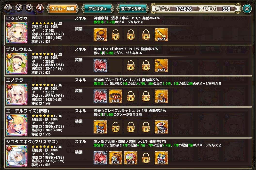 今から覚え直す花騎士のダメージ計算方法 Category:フラワーナイトガール Date:2018年06月03日 ダメージの計算式なんてさある程度ゲームをやり込まないとわからないしそもそも、やり込む人じゃないとあんまり関係ないよね!って考えていると、この先もずっと曖昧な知識で進みそうなので今回はちょっとお勉強してみます教材はWikiのFAQに書いてある文章からだいたいに察して汲み取りますWikiを見てみると害虫へのダメージ計算方法は主に2通りの式から成り立っていますまず1通り目基礎威力A=[(本人攻撃力×攻撃力アビ+装備分)÷2-相手防御力÷4]×乱数(0.95~1.05)これは主に、花騎士本体の攻撃力を計算する式になるのかな?キャラの攻撃力に、アビリティで攻撃力○○%アップを掛け算して、装備分を加える装備って攻撃力上昇アビには含まれないんですねそして、その数値を÷2していますそこから、相手の防御力÷4の値を引いて乱数を掛けるっとパっと見た印象だと、÷2が効きそうですねどんだけ攻撃力を上げても、÷2の補正がかかるこれチェックしておきましょう続いて2通り目【基礎威力A×弱点補正(1.5倍+弱点ダメージアビ)×クリ補正(1.5倍+クリダメージアビ)×スキル倍率×スキルダメージアビ×ダメージアビ×ボスへのダメージアビ】(小数点以下切り捨て、最低ダメージは1)ただし「全体攻撃以外の複数体攻撃スキル」or「好感度に応じて与ダメージ倍率が変わるスキル」の場合、最低ダメージ1処理の後にスキル倍率をかけます。↑これはとりあえず、無視します1通り目の計算式から出た数値を元に相手の弱点であれば1.5倍+αクリが発動したら1.5倍+αスキル倍率スキルダメージアビダメージアビボスへのダメージアビがそれぞれ乗算されるみたいですなんとなくわかって来たので、仮に管理人の編成で1個計算を試して見ましょう仮にシロタエギク(クリスマス)の与ダメを計算するとした場合に基礎攻撃力は9098(たぶん)スキルは便宜上4.7倍としておきましょう この編成での与ダメを考えるので諸々を抜粋すると上から攻撃力45%アップ弱点付与(1.5倍)クリダメ25%アップ攻撃力20%アップボス相手だとして攻撃力30%アップ攻撃力20%アップボス相手だとして攻撃力25%アップ与ダメ12%アップ与ダメ15%アップ攻撃力20%アップスキルダメ15%アップクリダメ60%アップ攻撃力20%アップスキルダメ15%アップ一番旨い状態を抜き出すとこんな感じまとめて攻撃力180%アップ弱点付与(1.5倍)クリダメ85%アップ与ダメ27%アップスキルダメ30%アップこうなりますそこでさっきの式を持ち寄って基礎威力A=[(本人攻撃力×攻撃力アビ+装備分)÷2-相手防御力÷4]×乱数(0.95~1.05)A=(9098×(180%)+4798)÷2(※相手の防御と乱数は無視)A=10587【基礎威力A×弱点補正(1.5倍+弱点ダメージアビ)×クリ補正(1.5倍+クリダメージアビ)×スキル倍率×スキルダメージアビ×ダメージアビ×ボスへのダメージアビ】A×1.5×(1.5+(85%))×4.7×(130%)×(127%)となり10587×1.5×(1.5+(85%))×4.7×(130%)×(127%)=289585となるはず・・・はず次回はこの考えがあってあるかを考えます PR