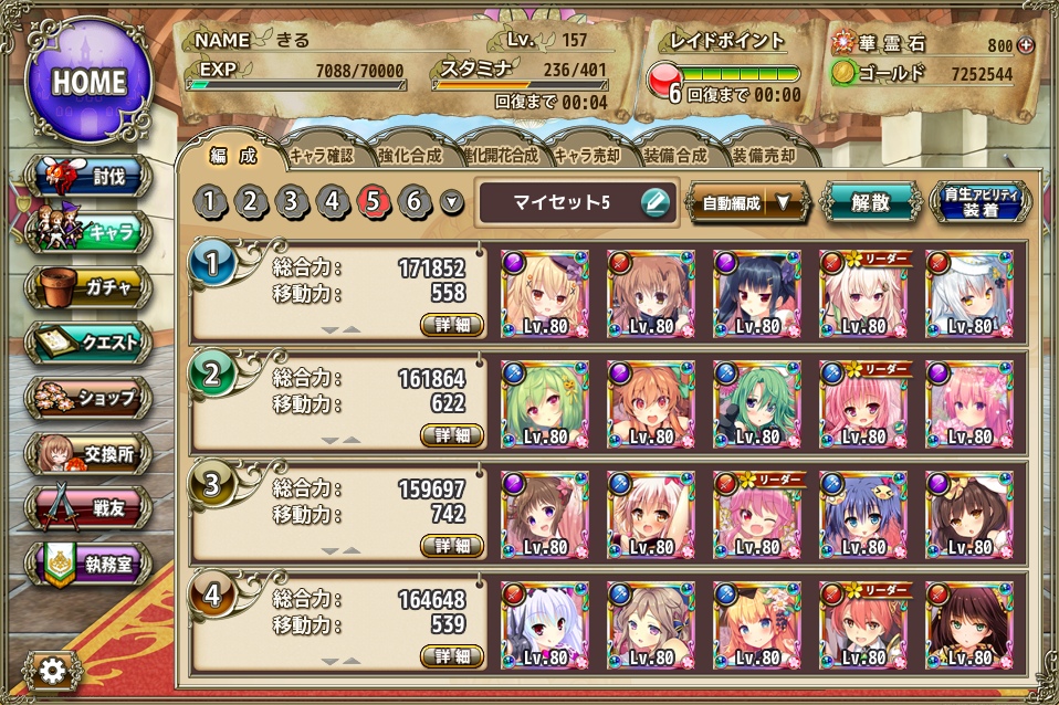 可愛い娘ちゃん編成を考えたらどうなるか! Category:フラワーナイトガール Date:2018年08月20日 人々の永遠のロマン俺様の好みの可愛い子ちゃんだけでハーレム部隊を作りたいそれは例えゲームが変わったとしても永遠と求め続ける夢であり、キャラを集め続ける一つの理由でもある好きなキャラで周回したい否、その前に好きなキャラだけを集めて編成を作りたいそんなこんなで作ってみたのがこちら 全面的に管理人の好みで作っています主に上の方に行くほど管理人も好きなキャラであり一番下の面々は後々入れ替わるかも知れませんだいたい、見た目的にどんなキャラが好きなのかはなんとなく同類の方な方が察しが付くかと思います主にジト目とロリとボーイッシュ系と貧乳が好き後はキャラの口癖とか、その他管理人の心が揺さぶられたキャラなどが入り乱れておりますただ、これ虹キャラメインで作っているので☆5を昇華させたり出来ればもうちょっとメンバーを入れ替えたり出来るのでまだまだ改良の余地有りランタナとハスの位置を入れ替えても良いかなと思ったりウサギノオをもうちょっと小さい子に変えた方が安定感が出そうとか見ていて飽きません簡単なステージならこれで周回するのもありかなぁー PR