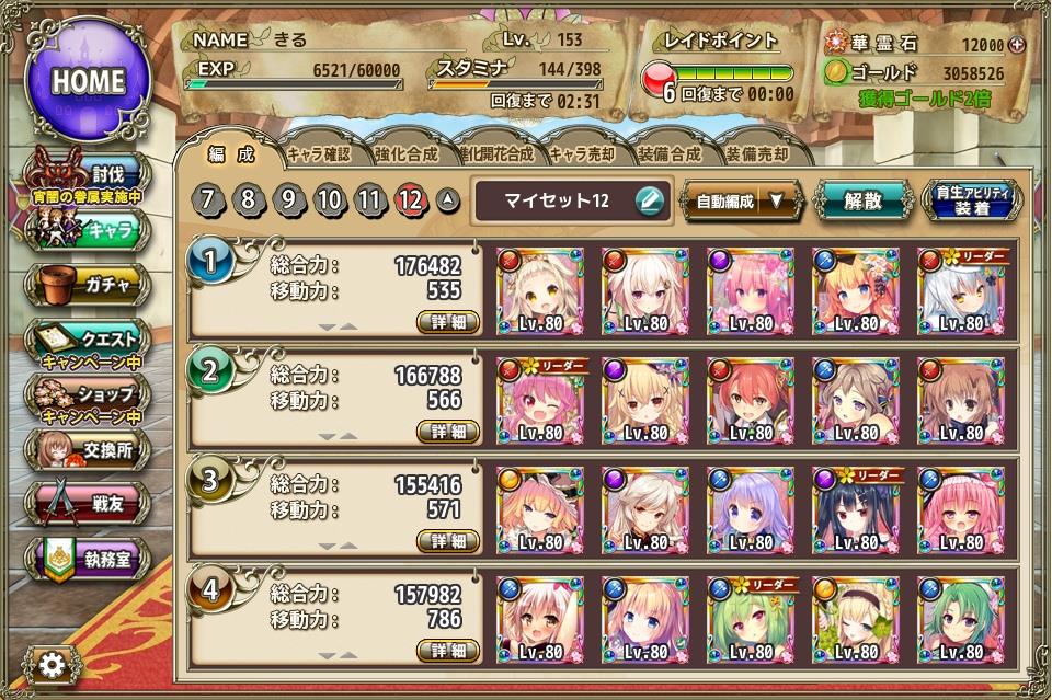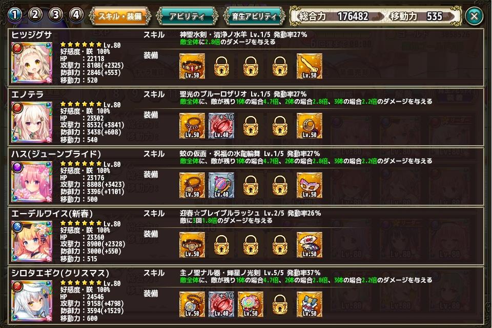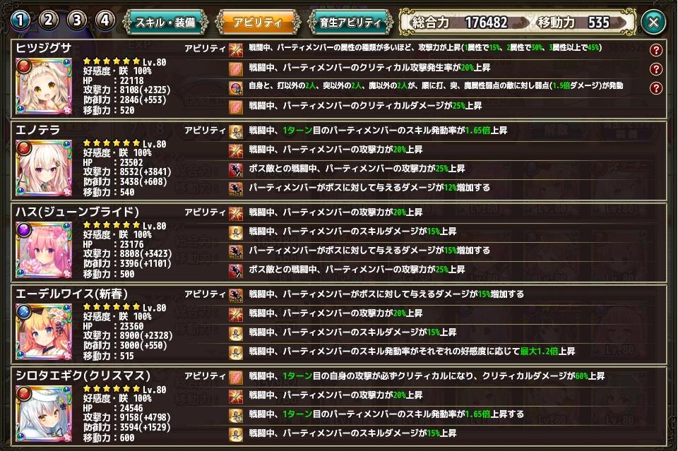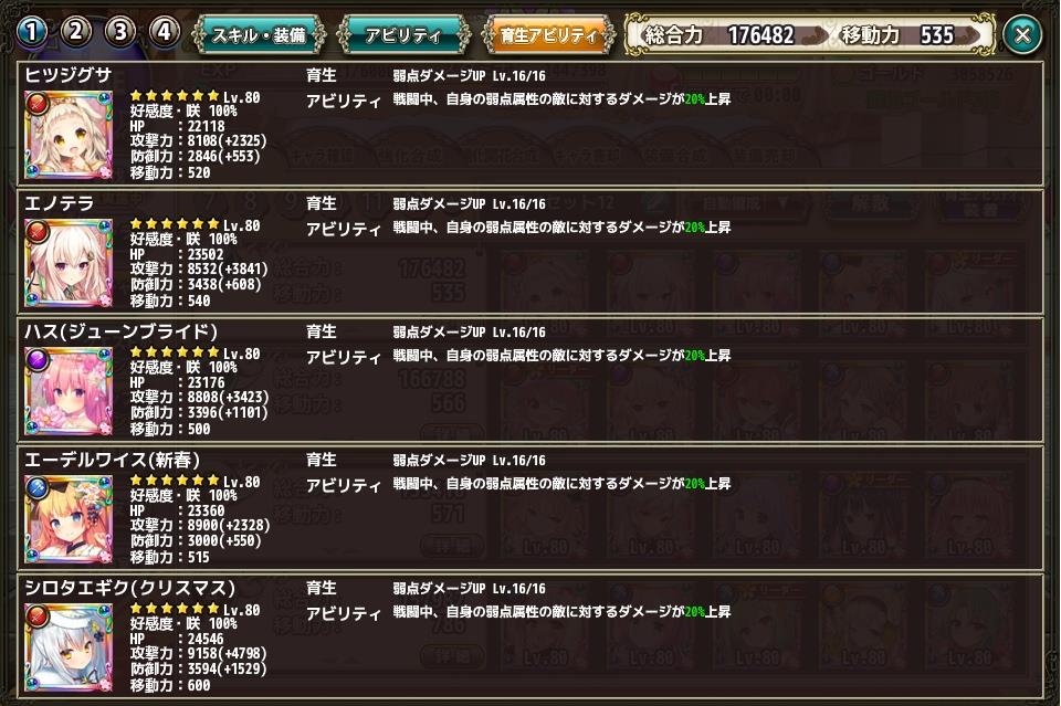 管理人の7月中旬での部隊編成 Category:雑記 Date:2018年07月16日 本日から細かく4日間コースで紹介しようかと思います最近の新虹入手やらなんやらで中身の入れ替えを行った結果がこちら上から順番に紹介して行きますだいたい、ここの編成は固まって来たかと思う管理人の主要部隊やはり1.65倍編成は正義エノテラちゃんやシロタエギクが活躍してくれるのがポイント段々とエーデルワイスやら、ハスやらも好きになってくると言うか使ってると愛着わくよね!先に育成アビリティを載せときますがここは脳停止で弱点ダメアップにしときましたエノテラ以下4名で全体を攻撃したり残った1体を撲滅させたりとその辺は臨機応変に動いてくれる予定エノテラとシロタエギクでスキル1.65倍を×2エーデルワイスで1.2倍のちょこっとサポート後はヒツジグサで弱点付与を行いますまず、3タイプ存在しているのでヒツジグサで攻撃力が45%上昇クリ発動率が20%上昇(←そこまで効果はない)クリダメージが25%上昇エノテラで攻撃力が20%ボス相手だと更に25%ボスへの与ダメが12%上昇ハス(ジューンブライド)で攻撃力が20%スキルダメージが15%ボスへの与ダメが15%ボス相手に攻撃力が25%上昇エーデルワイス(新春)でボスへの与ダメが15%攻撃力が20%スキルダメージが15%上昇シロタエギク(クリスマス)で攻撃力が20%スキルダメージが15%(自分のみ1ターン目クリダメ60%アップ)と、攻撃面に特化した編成に仕上がっていますこれをそれぞれトータルすると攻撃力125%アップボス相手の場合更に50%アップクリダメ25%アップスキルダメージ45%アップボスへの与ダメ42%アップこれをメモしといて、そのうち与ダメ計算でまた使ってみましょうこの編成に関してはもう早々変わることはないかな?今の課題は他の部隊の充実化になって来たと思います PR