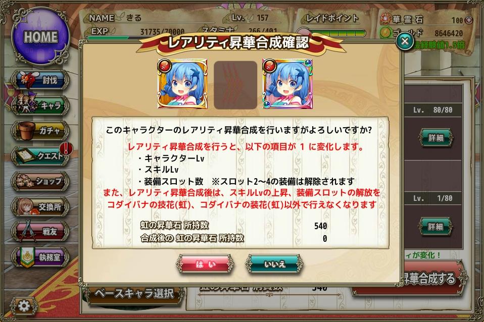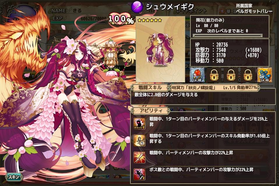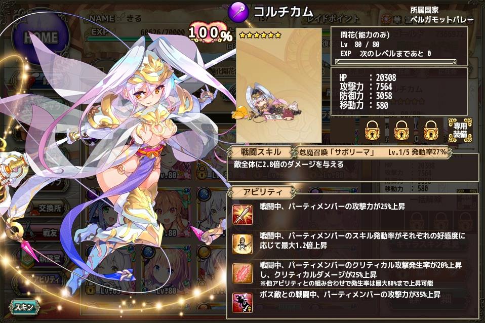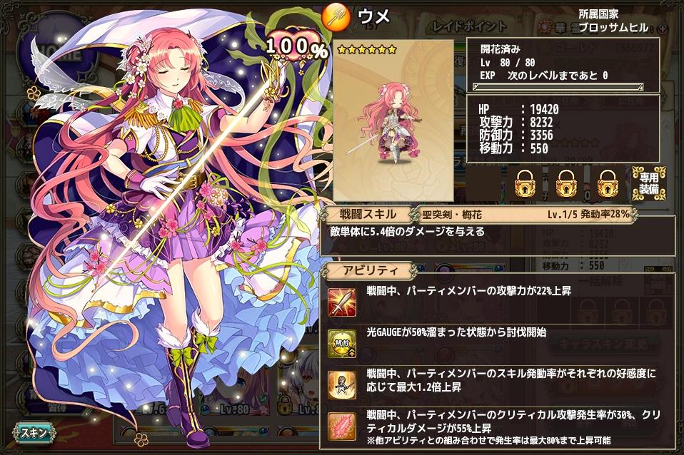 スマホ版リリースに合わせたあれこれどれ Category:フラワーナイトガール Date:2018年09月02日 スマホ版リリースをそっと見守っている管理人なのですがまぁ、結局の所、今の様子を見ているとベータ版に近いような仕様なのでもっといろいろ実装されてから本格的にアピールした方が良い気がするのは気のせいだろうか・・・とか言っても、普通にはプレイ出来るぐらいには仕上がっているのでもうちょいの辛抱だと思います今はまだDMMのブラウザ版から入った方がわかりやすいと思いますスマホの画面とにらめっこして編成とかは考えられるので別に管理人は使ってないことはありませんそれはそれで置いといて・・・まず、スマホ版のアプリ配信に伴い☆6が入手出来るガチャチケが来ましたね未入手キャラが1体確定なので誰が来るかな~ロリキャラ来ないかな~と引いてみた所お姉さんキャラが来た(いや、見た目がね)管理人の好みは基本的にロリか貧乳かジト目かそれ以外かで分かれる・・・とかそんな話はどうでも良いのですがウメが出ましたね別に見た目は嫌いと言うわけではなくて好みではないと言う事なのでお間違えの無いように例えば、ステーキが大好物な人が居て刺し身は普通には食べるけど、好みではないと言うそのぐらいの認識刺身丼があれば刺身丼を食べますがそこに一緒にステーキ丼があればステーキ丼を選ぶとそのぐらいの認識うん。何だこれウメの特徴を考える上で恐らく外せない部分としてはクリティカルの発動率30%アップだと思います加えて、クリティカルダメージも55%アップとクリパには欲しい人材なのではないでしょうか後は、何気に光ゲージが50%アップするのってのもクジラ艇を意識すると重要だったりもするあまり意識してなかったけれど、入手してみると思った以上に強力なキャラでした(まぁ、わりと最近調整されたってのもありますが)クリティカルの発動率30%ってのは何が凄いかと言うと30%がもう1体居たら30、30、20%で組めば、それでもう上限の80%アップになるんですなるんですよつまり、空いた2枠に1ターン目スキル1.65倍を入れるとスキルが100%発動して、更に80%でそれがクリティカルになるのも夢ではないとそれを考えたら、やってみたくなって作っちゃったなけなしの昇華石を全部ぶっこんで作っちゃった作っちゃったやっふーい!!8割型見た目で選んでこの娘を選択ちびキャラの動きが大変可愛らしいので即採用クリティカル発動率が30%アップするのでこれで上限の80%だぁ!と思っていたらさ・・・この後に編成をいろいろ考えたいたらちょっと、考えがわかったその件はまた次回にまとめます後は、これ全員配布キャラのコルチカムいやさぁ、どうせこの手の全員配布キャラってさぁ例えば、最高レアが☆6だとしたら、性能的には☆5.5ぐらいの性能になっちまうってのが良くある話ですよね?ところがどっこいアビリティを見ると普通に編成に入れられるだけの物をちゃんと持ってるのが素晴らしい実際に管理人の第二のクリパに入りました新規で始められた方でクリパを作ろうと思ったらこれ配られて良かったと思う方も大勢居るでしょう後は、あれですね花騎士でよくある5000円で選べるチケット的な奴ですね一応余裕を持って編成出来るだけのキャラを持っているのですが好きあらばより中身を充実させようと積極的に狙っていきます今回選んだのはシュウメイギクですねロリキャラとかじゃない?管理人にも見た目以外で選ばないとならない時があるのですよ性能面で!ちなみに、ガチで見た目も良い性能も欲しいコムギと迷いましたでも、今回はシュウメイギク次のチャンスがあればコムギか、他に欲しいキャラを狙いますこれだけ欲しいキャラが増えたので次回は編成をまた改造してみますだいたい、記事を書く前に部隊が変わるのが最近の管理人記事の更新がめっちゃ滞っています頑張る、頑張りたい、頑張ってみたい、頑張ろうと心の中には気持ちが残っています PR