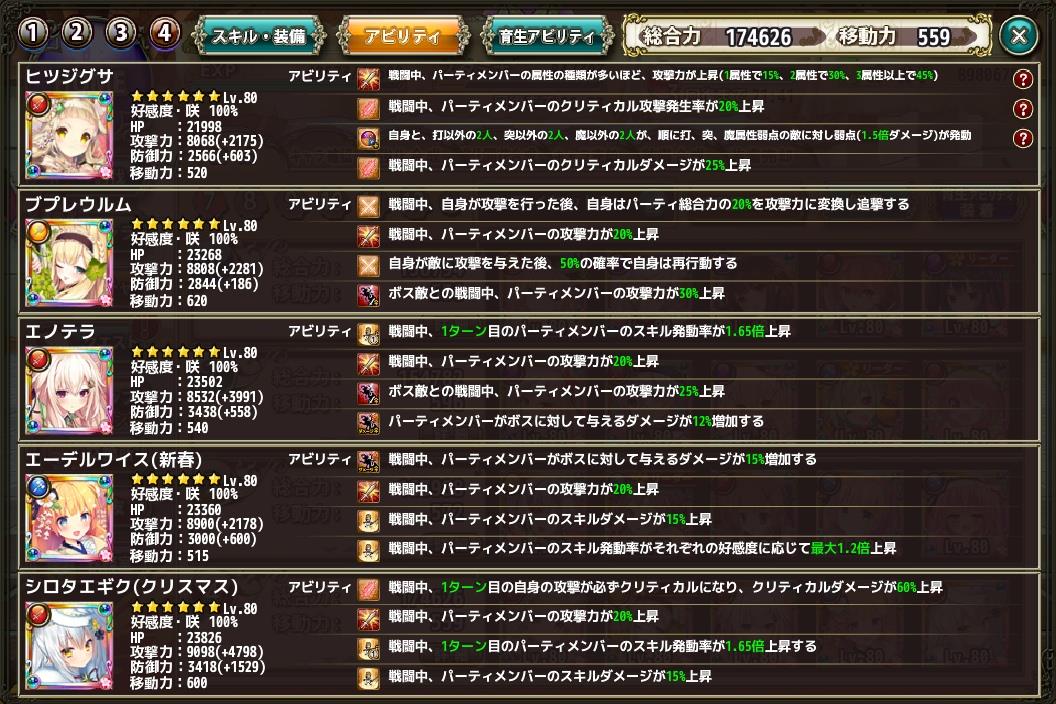 今から覚え直す花騎士のダメージ計算方法 Category:フラワーナイトガール Date:2018年06月03日 ダメージの計算式なんてさある程度ゲームをやり込まないとわからないしそもそも、やり込む人じゃないとあんまり関係ないよね!って考えていると、この先もずっと曖昧な知識で進みそうなので今回はちょっとお勉強してみます教材はWikiのFAQに書いてある文章からだいたいに察して汲み取りますWikiを見てみると害虫へのダメージ計算方法は主に2通りの式から成り立っていますまず1通り目基礎威力A=[(本人攻撃力×攻撃力アビ+装備分)÷2-相手防御力÷4]×乱数(0.95~1.05)これは主に、花騎士本体の攻撃力を計算する式になるのかな?キャラの攻撃力に、アビリティで攻撃力○○%アップを掛け算して、装備分を加える装備って攻撃力上昇アビには含まれないんですねそして、その数値を÷2していますそこから、相手の防御力÷4の値を引いて乱数を掛けるっとパっと見た印象だと、÷2が効きそうですねどんだけ攻撃力を上げても、÷2の補正がかかるこれチェックしておきましょう続いて2通り目【基礎威力A×弱点補正(1.5倍+弱点ダメージアビ)×クリ補正(1.5倍+クリダメージアビ)×スキル倍率×スキルダメージアビ×ダメージアビ×ボスへのダメージアビ】(小数点以下切り捨て、最低ダメージは1)ただし「全体攻撃以外の複数体攻撃スキル」or「好感度に応じて与ダメージ倍率が変わるスキル」の場合、最低ダメージ1処理の後にスキル倍率をかけます。↑これはとりあえず、無視します1通り目の計算式から出た数値を元に相手の弱点であれば1.5倍+αクリが発動したら1.5倍+αスキル倍率スキルダメージアビダメージアビボスへのダメージアビがそれぞれ乗算されるみたいですなんとなくわかって来たので、仮に管理人の編成で1個計算を試して見ましょう仮にシロタエギク(クリスマス)の与ダメを計算するとした場合に基礎攻撃力は9098(たぶん)スキルは便宜上4.7倍としておきましょう この編成での与ダメを考えるので諸々を抜粋すると上から攻撃力45%アップ弱点付与(1.5倍)クリダメ25%アップ攻撃力20%アップボス相手だとして攻撃力30%アップ攻撃力20%アップボス相手だとして攻撃力25%アップ与ダメ12%アップ与ダメ15%アップ攻撃力20%アップスキルダメ15%アップクリダメ60%アップ攻撃力20%アップスキルダメ15%アップ一番旨い状態を抜き出すとこんな感じまとめて攻撃力180%アップ弱点付与(1.5倍)クリダメ85%アップ与ダメ27%アップスキルダメ30%アップこうなりますそこでさっきの式を持ち寄って基礎威力A=[(本人攻撃力×攻撃力アビ+装備分)÷2-相手防御力÷4]×乱数(0.95~1.05)A=(9098×(180%)+4798)÷2(※相手の防御と乱数は無視)A=10587【基礎威力A×弱点補正(1.5倍+弱点ダメージアビ)×クリ補正(1.5倍+クリダメージアビ)×スキル倍率×スキルダメージアビ×ダメージアビ×ボスへのダメージアビ】A×1.5×(1.5+(85%))×4.7×(130%)×(127%)となり10587×1.5×(1.5+(85%))×4.7×(130%)×(127%)=289585となるはず・・・はず次回はこの考えがあってあるかを考えます PR