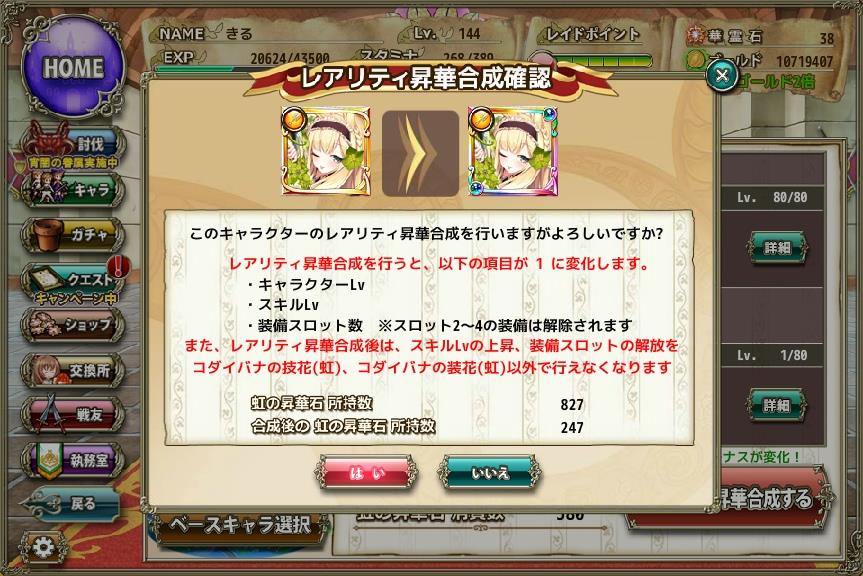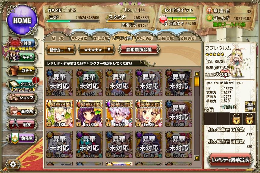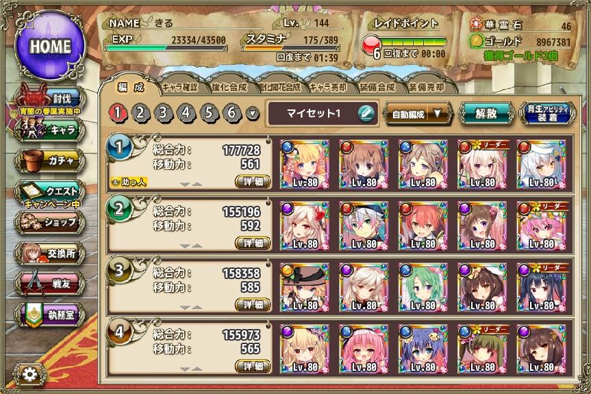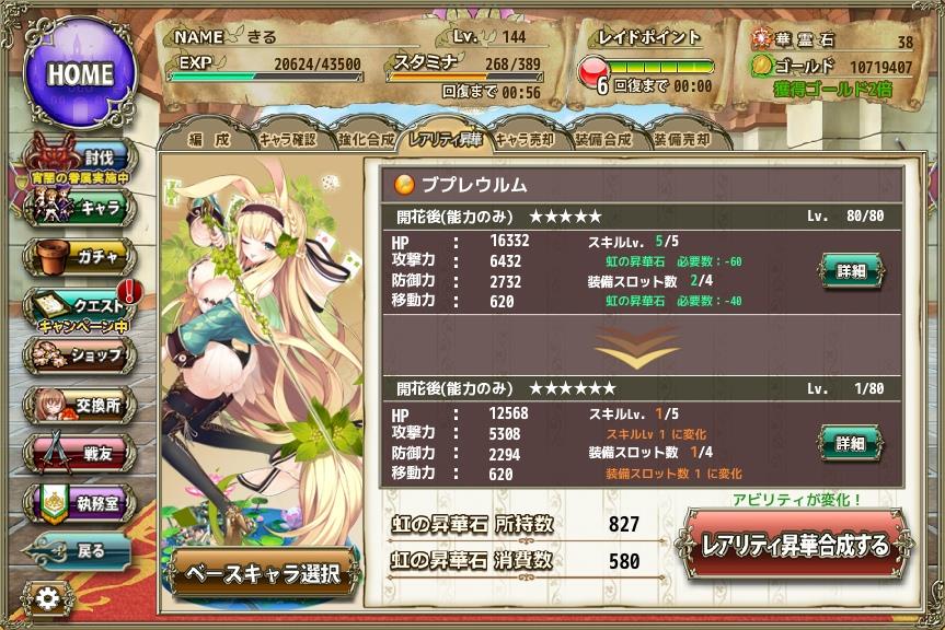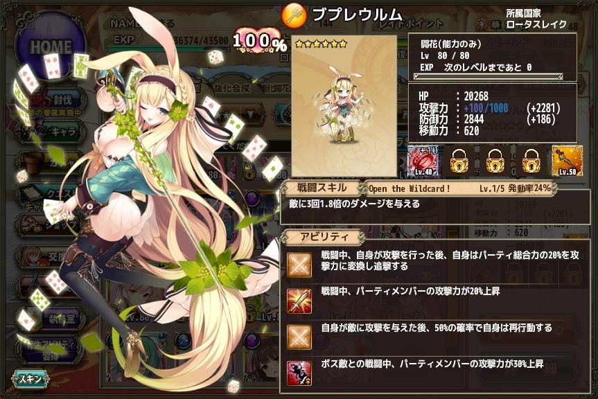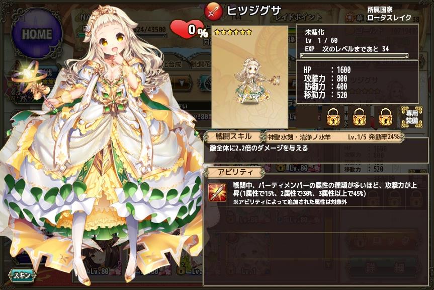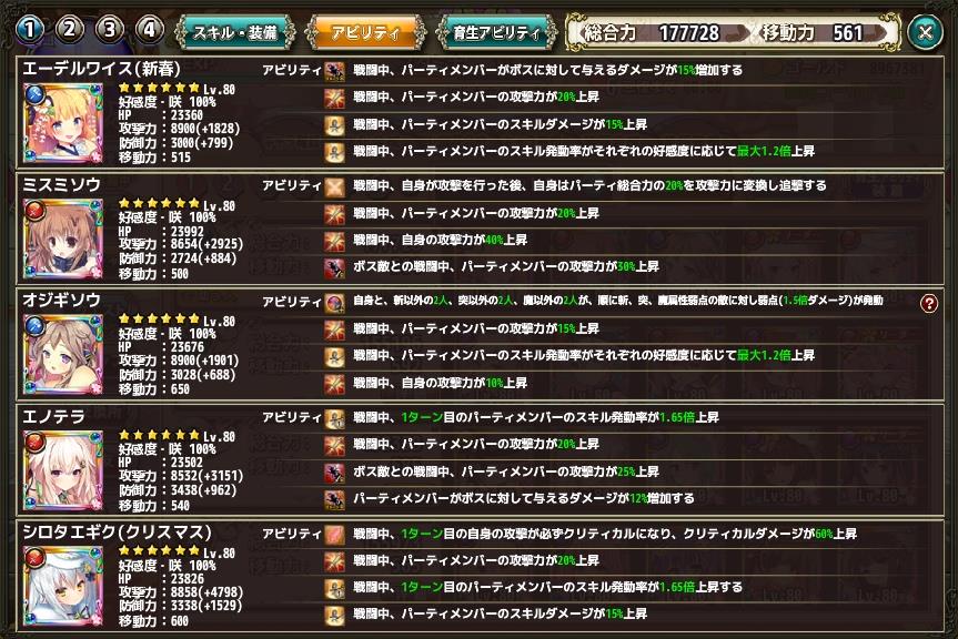 走っても胸が揺れないのは、むしろ長所。 Category:フラワーナイトガール Date:2018年05月07日 GWに何か成果を残そうと思ったりして新実装のヒツジグサ(虹)ちゃんがカナリいい感じに管理人の戦力アップに繋がるな~と思ってオジギソウ→ヒツジグサにメンバーチェンジしてみましたちなみに、ヒツジグサをどうやって入手したかと言えば・・・まぁ、10連ガチャ9回ぐらいやったけど虹なんか出るわけがない今後用に保管しといた虹メダル300枚を犠牲にヒツジグサをお迎えしちゃいました大丈夫、どこかでまた虹メダル入手出来るって・・・きっと個人的に、トリカブトちゃんの衣装替えがどこかで来るってのを待っていたのですが、まぁ、あれですね実装されてから考えるそれが一番だ!(本記事のタイトルはトリカブトちゃんのセリフから頂いております)オジギソウとかヒツジグサのアビリティはWikiが充実しているのでWiki見るのが一番なのですが前々からオジギソウのアビリティが若干攻撃面で物足りないかな?と思ったりしていて・自身と、斬以外の2人、突以外の2人、魔以外の2人が、 順に斬、突、魔属性弱点の敵に対し弱点(1.5倍ダメージ)が発動 ※自身と同じ弱点属性は対象外となり、同効果アビリティは重複しない・戦闘中、パーティメンバーの攻撃力が15%上昇・戦闘中、パーティメンバーのスキル発動率がそれぞれの好感度に応じて最大1.2倍上昇:戦闘中、自身の攻撃力が10%上昇これがヒツジグサだと・戦闘中、パーティメンバーの属性の種類が多いほど、攻撃力が上昇 (1属性で15%、2属性で30%、3属性以上で45%) ※アビリティによって追加された属性は対象外・戦闘中、パーティメンバーのクリティカル攻撃発生率が20%上昇 ※他アビリティとの組み合わせで発生率は最大80%まで上昇可能・自身と、打以外の2人、突以外の2人、魔以外の2人が、 順に打、突、魔属性弱点の敵に対し弱点(1.5倍ダメージ)が発動 ※自身と同じ弱点属性は対象外となり、同効果アビリティは重複しない・戦闘中、パーティメンバーのクリティカルダメージが25%上昇クリティカルの発動アップとダメージアップが見込めるようになります他にパーティに3属性のキャラが揃うと攻撃力が45%もアップすると言う驚きの性能がありますその辺の火力アップを見込んで今回思い切ってメンバーチェンジに挑んでみた次第です編成枠としては下のSSの一番上を変える形ですかねオジギソウからヒツジグサにメンバーチェンジ・・・しかし、残念ながら1タイプが足りませんヒツジグサが斬なので打、斬、斬、斬、斬と、これじゃ残念だ!そこで、一つ注目したのが昇華機能ですねこれもまた、管理人は日頃からチャンスをつかめと☆5のトリカブトちゃんを昇華してからずーっと確保してきた昇華用の石をだいぶ持っているのでこう言うものは無駄に取っといても仕方ねぇ使う時にどかっと使うもんだとこの編成で他に入れ替えが可能となる☆5キャラを探していたらこちらのププレウルムちゃんが見事にヒットイケ、イケ、イケー!っと勢いよく昇華させちゃいます本当は装備スロットをもうちょっと拡張出来れば良かったのですがまぁ、まだ昇華石あるからそのうち集まるだろう・・・きっと後悔はしませんか?なぁに、後悔ってものは後悔した時に考えれば良いのですよ今は手持ちが充実した事を素直に喜びましょうそんな訳でププレウルムさんを戦力としてお出迎えアビリティの説明をしていませんでしたがミスミソウとほぼ同じで1個だけアビリティが違う感じです(詳しくはWiki見といてください)部隊の火力確保の為にオジギソウ→ヒツジグサにメンバーチェンジそして、ヒツジグサのアビリティを活かす為にミスミソウ(斬タイプ)→ププレウルム(突タイプ)にアビリティほぼ同等なものをチェンジその際、虹メダル300枚、昇華石580個消費と言う見る人が見れば結構な贅沢をした管理人でした~完~もうちょいネタ用意してましたが思ったより長くなったので今日はこの辺で終了としときます PR